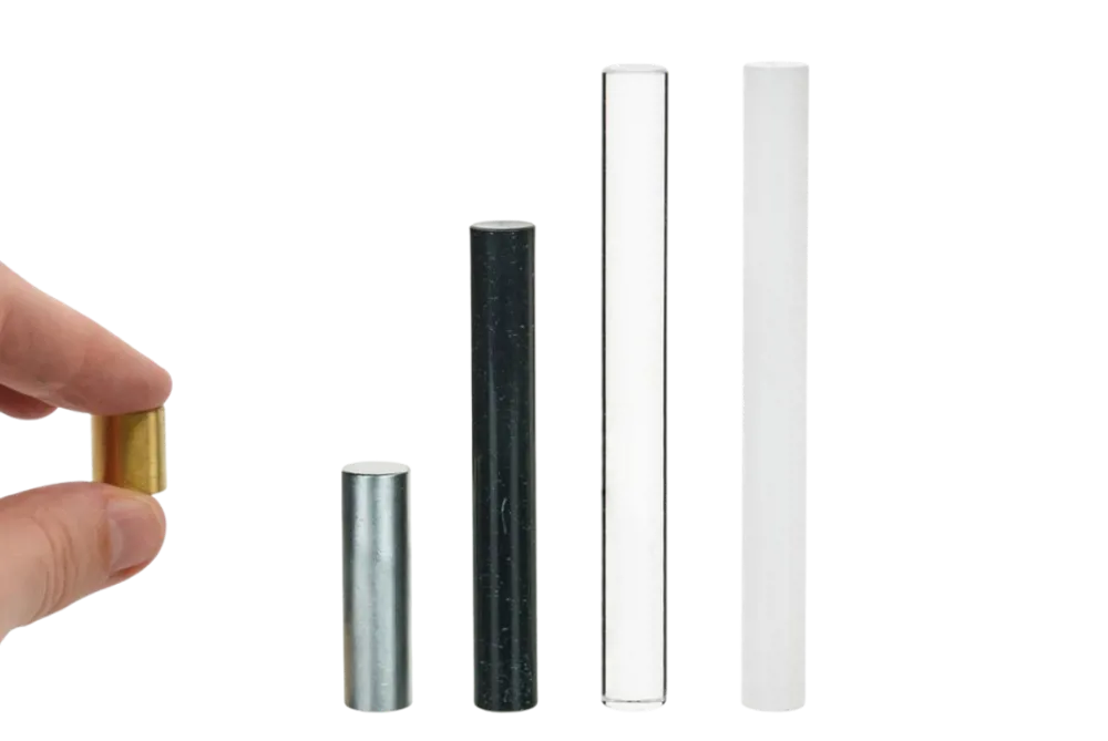 This set consists of 5 cylinders with the same mass of approx. 15 g, but made of different materials: aluminium, brass, nylon, acrylic and PVC.