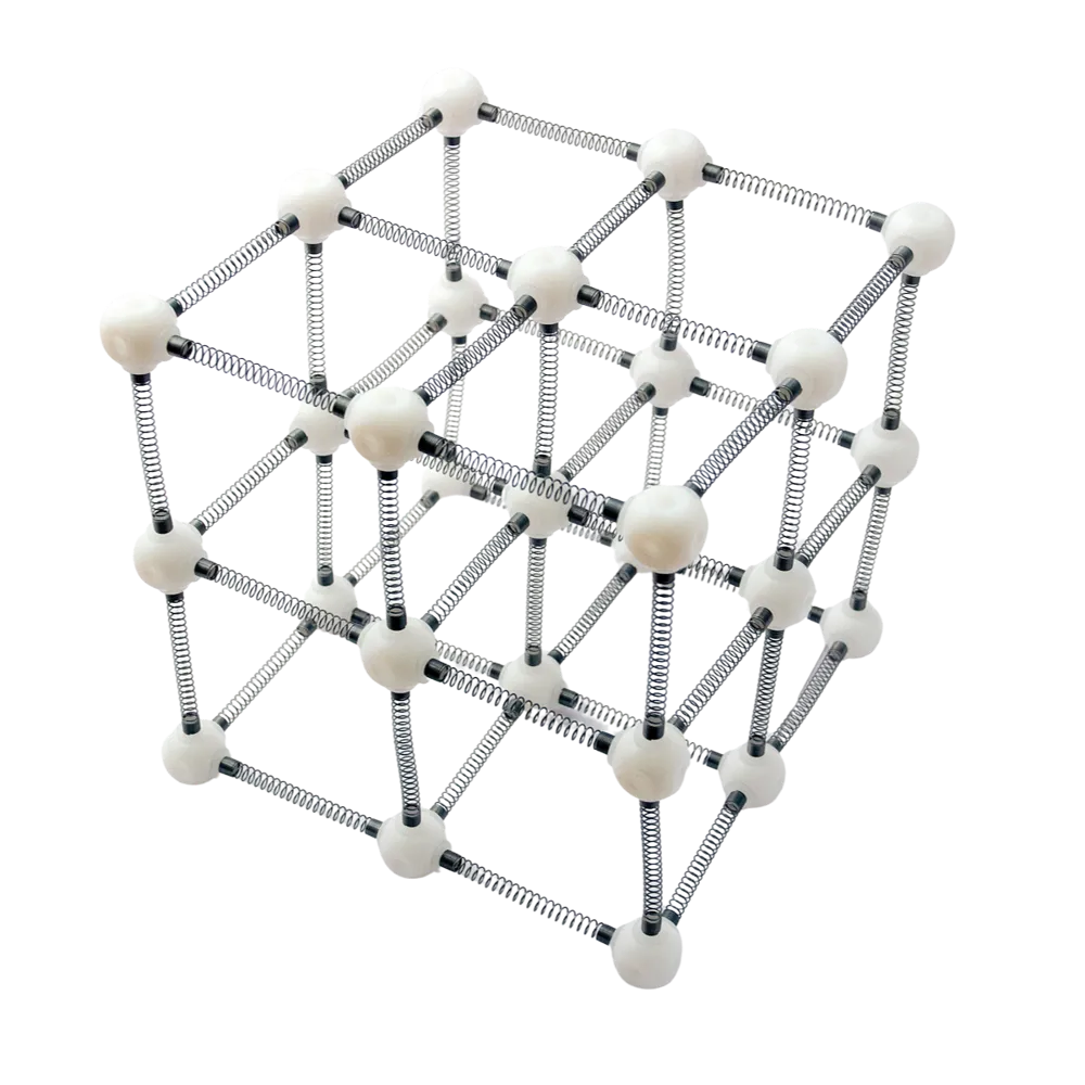 The model consists of interconnected spheres connected by flexible springs, which are set in motion by a light push. It is delivered unassembled in size 20 × 20 × 20 cm and is intended as a visual and tactile teaching model that supports the understanding of the thermal movements of atoms and molecules.