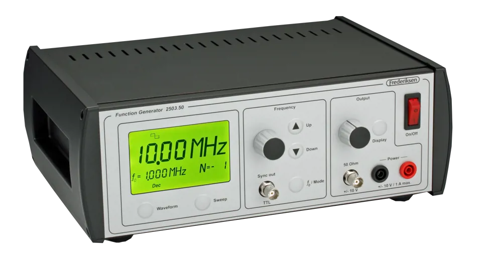 This function generator is developed and produced by Frederiksen Scientific and is suitable for, for example, experiments with standing waves or for studying sound waves at different frequencies. The generator can run through frequencies in intervals of ten decades from 0.001 Hz to 10.00 MHz with a tolerance of just 0.005%.