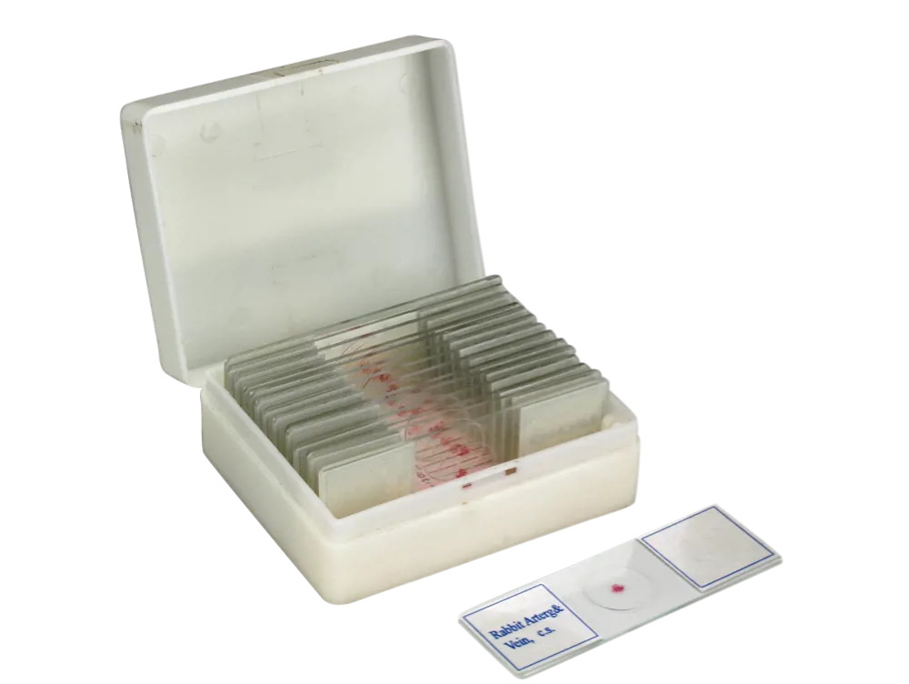 Complete set of 25 identical microscope slides of cross-sections of artery and vein. Each slide is clearly labeled with an English description. As this is a natural material, minor variations may occur.