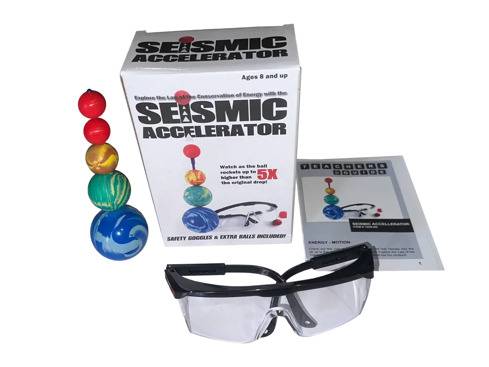Ninja Balls are a set used to demonstrate the concept of momentum transfer in a simple and visually compelling way. When the set is dropped from a low height, you can observe how the kinetic energy is transferred through the balls, causing the top ball to bounce significantly higher than its starting point. The set consists of five balls and a pair of plastic safety glasses, which should be worn during the experiment to protect your eyes.