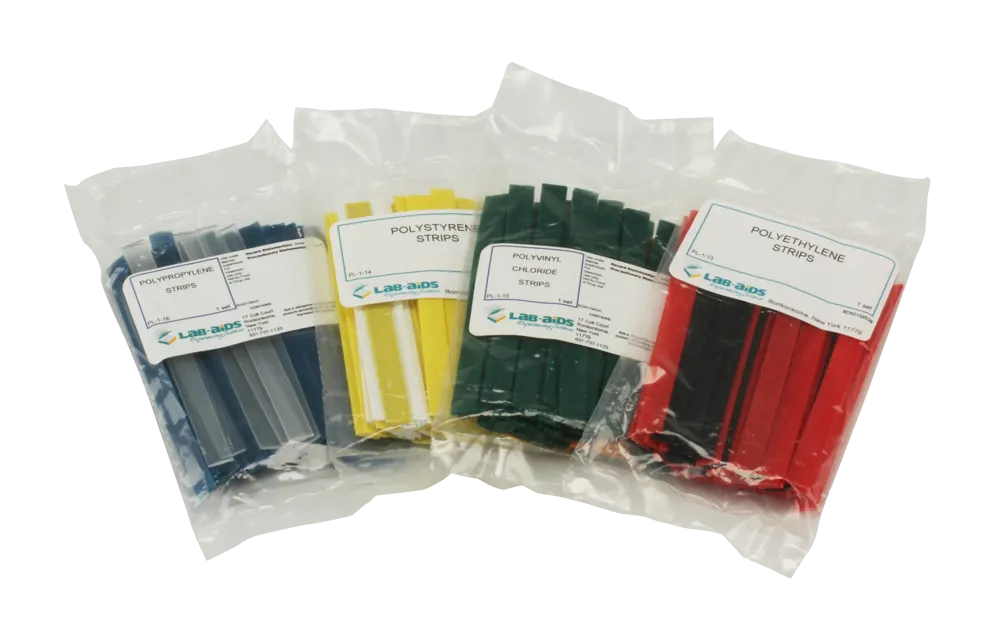 This set contains 4 different types of plastic materials: PE (polyethylene), PVC (polyvinyl chloride), PS (polystyrene) and PP (polypropylene).