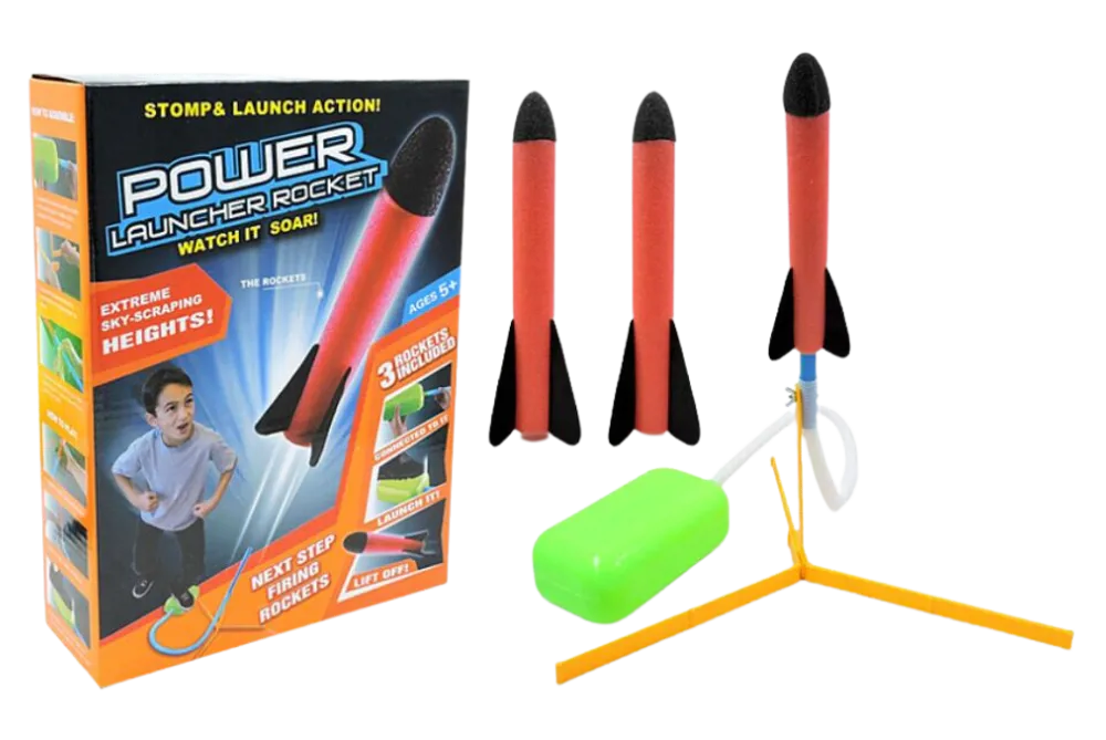 Foot pump rockets are a set where rockets are launched by stepping on an air cushion. The harder you step, the higher the rocket flies, which can reach up to 20 meters. The rockets are equipped with a soft rubber cap so that they can land safely without damaging the surroundings. The set comes ready to use and contains 3 rockets, ramp, hose and air cushion.