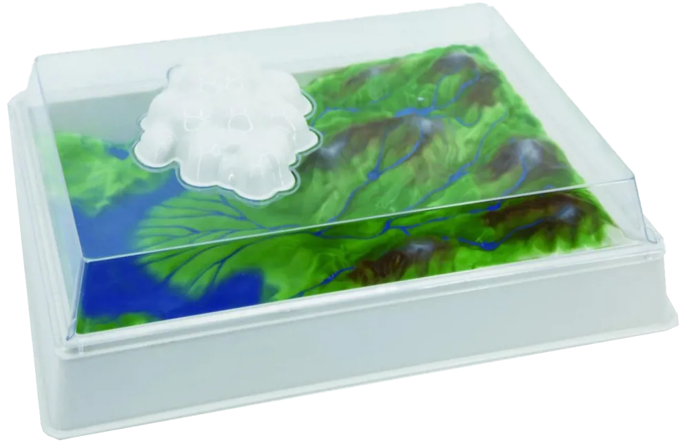 The model consists of a 12 × 35 × 45 cm plastic tank with a sloping landscape, where mountains, valleys, coast and sea are represented. The lid is equipped with a container shaped like clouds, in which you place ice cubes. When a lamp (not included) is used as the “sun” and heats the water in the tank, the steam will rise, condense under the cold area of ice and fall as rain over the landscape before the water runs back to the “sea”.